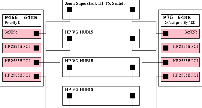 I had to solve a small hardware incompatibility. HP-VG (Voice Grade) 100Mbit network is not fast Ethernet compatible. Having neither the money nor the will to replace the stuff and having the need to expand the system I had to find a solution which was a) stable and b) cheap.