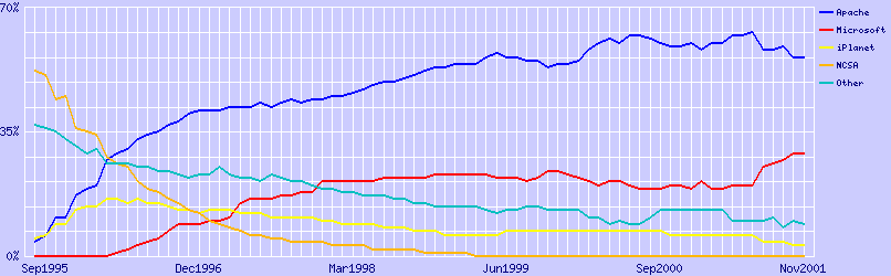 Historically, Open Source Software were used to realise Internet/Intranet servers, because their growth was following the one of the Net. It's so possible to cover all aspects linked to the Internet, from the Web server ( Apache ), FTP server (Wu-Ftpd), DNS server (Bind), the E-Mail server (Sendmail or PostFix ), the Usenet groups server (INN), the proxy server (IPmasqadm), the firewall (IPChains or IPTables), Virtual Private Network (OpenSSH), the Cache server for the Web ( Squid ) or also the Time server (NTP) or as directory service(LDAP) server, or as content management(Midgard) server ... All these software are available in standard in a Linux distribution. The client computer should be equiped with the software corresponding to the application used (mail reader, news reader, web browser, ...) whatever its operating system. The choice of the client is free, as all these tools respect the standards decreed in the RFCs.