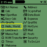 Here's some pics and screen shots of the emulator (running under windows) running hello.prc (compiled under linux). You'll note the name of the app is what was specified on the build-prc command line. I also tested the hello.prc file on my PalmIIIe. It Works!