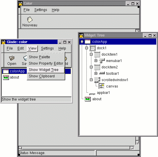 Bir aleti oluşturmak için GladeXML fonksiyonu kullanılır. Tabii ki color.glade dosyasına giden yolu ayarlamanız gerekir. Bizim Glade ile tanımladığımız colorApp Gnome Uygulama Penceresini oluşturur ve gösterir. Dönüş değeri kullanışlı yöntemlerle bir nesnedir - gerçekte bir sınıf.