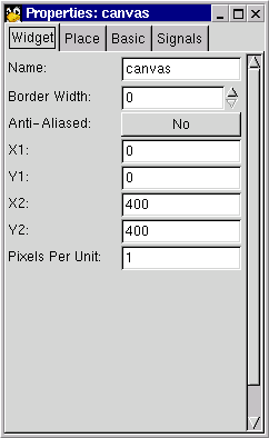 Bundan sonra Gnome uygulama aletinin asıl alanına bir kanvas ekleyin. properties(özellikler) diyaloğundan maksimal koordinatları 400'e, maksimal yükseklik ve genişliği de 400'e ayarlayın.