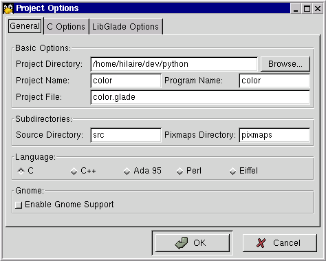 Glade alet çubuğundaki Options(Seçenekler) düğmesinden Project Options 'ı çağırın. General(Genel) tabakasında, plan girişlerini aşağıdaki gibi ayarlayın: